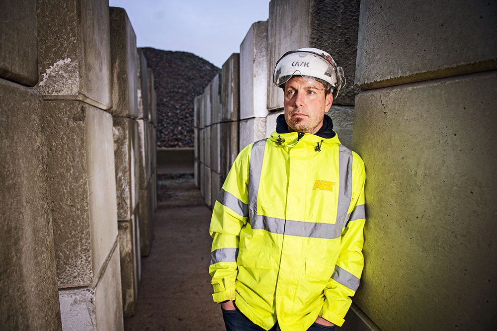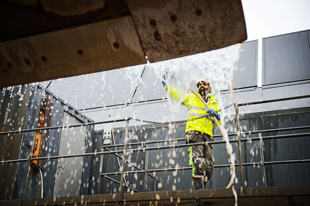 På ABT Betong i Norrsätra strax nordost om Sollentuna centrum håller Patrick Johansson som bäst på att spola rent i skopan på en Cat 938M mellan två körningar. Hans jobb är att mata anläggningen med råvaror och se till att allt flyter som det ska i produktionen.
