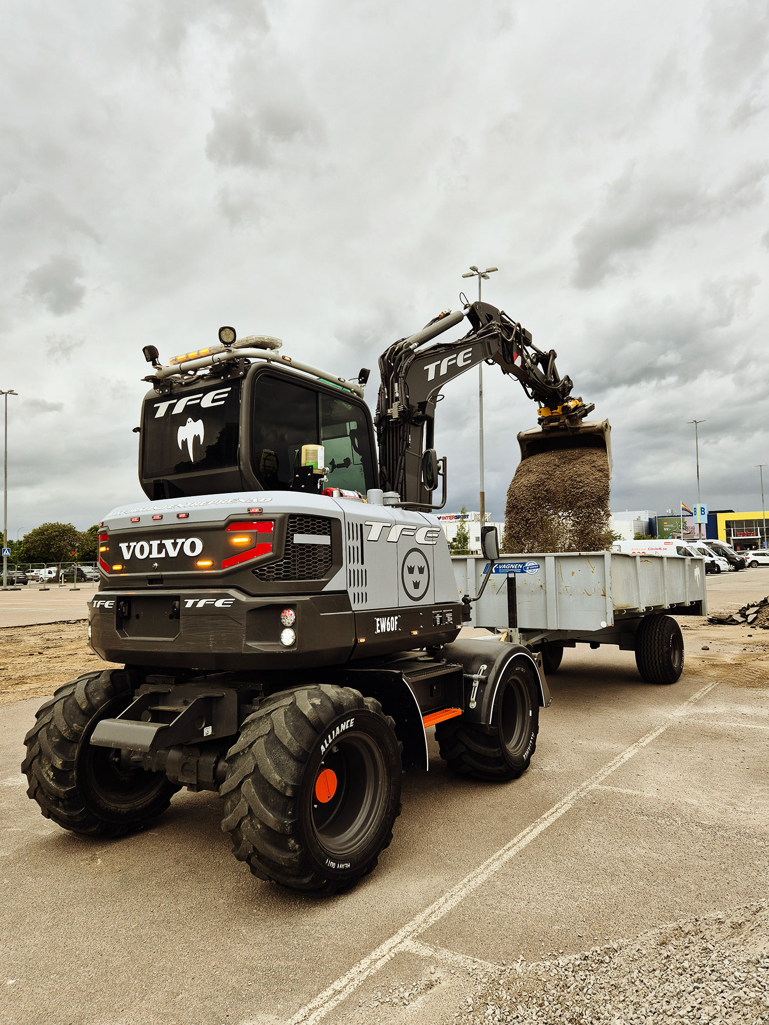 – Ja, det är ju chefens idé såklart, och vi har faktiskt en maskin till som är grå, en lite större Volvo. De tre kronorna sitter på flera maskiner och verkar faktiskt sprida sig, jag har sett det på fler maskiner i trakten.