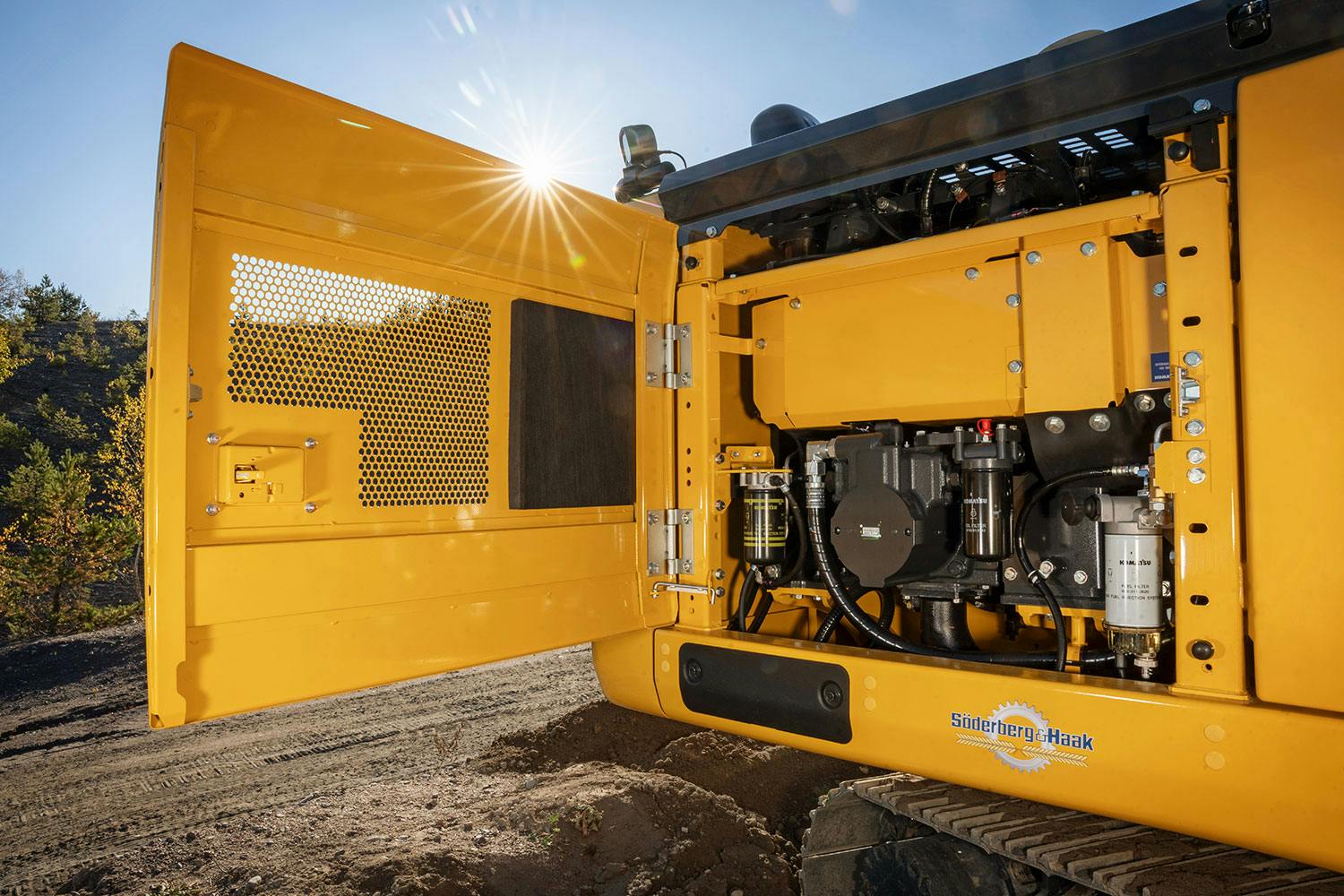Avgasreningen är byggd så att den får plats bredvid motorn. Det gör att maskinen blir slät ovanpå vilket i sin tur gör att flera saker blir bättre. Sikten bakåt över motvikten blir bättre och det är lättare att gå ut på maskinen för daglig tillsyn och service.