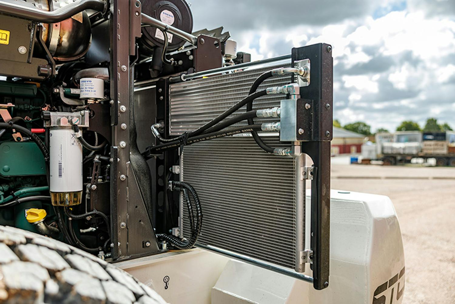 Gott om utrymme för att fylla på centralsmörjningen; display i hytten ger felkoder om centralsmörjningen. Bra placerad AdBlue-tank. Det är lätt att få fram och följa i displayen hur många timmar det är kvar till olika service-intervaller.