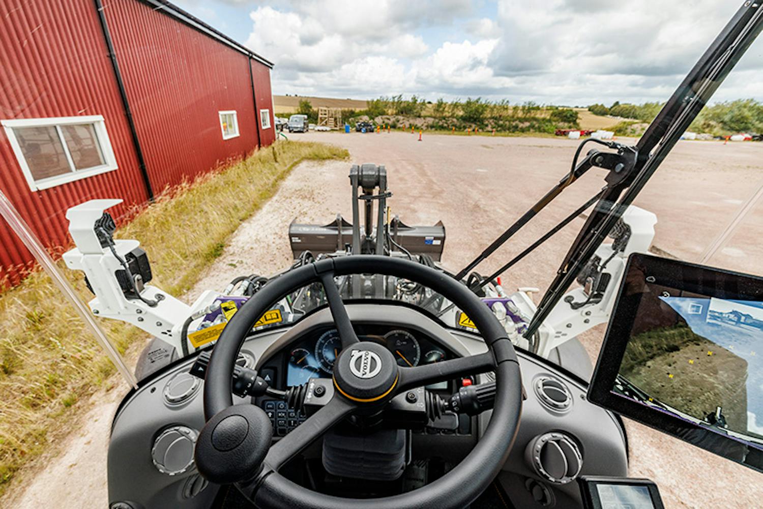 Mycket bra första intryck när jag kollar runt på den här hjullastaren från Volvo. Det här är ju också en av företages paradmaskiner. Hjullastare kan man. Runda och fina former – stilrent. Mycket enkla och tydliga knappval vid den stora displayen. Bra med backkamera med en hjälplinje som visar hur nära föraren är ett hinder, samt ett pipande ljud när man är riktigt nära. Mycket bra hjälpmedel som ökar säkerheten.