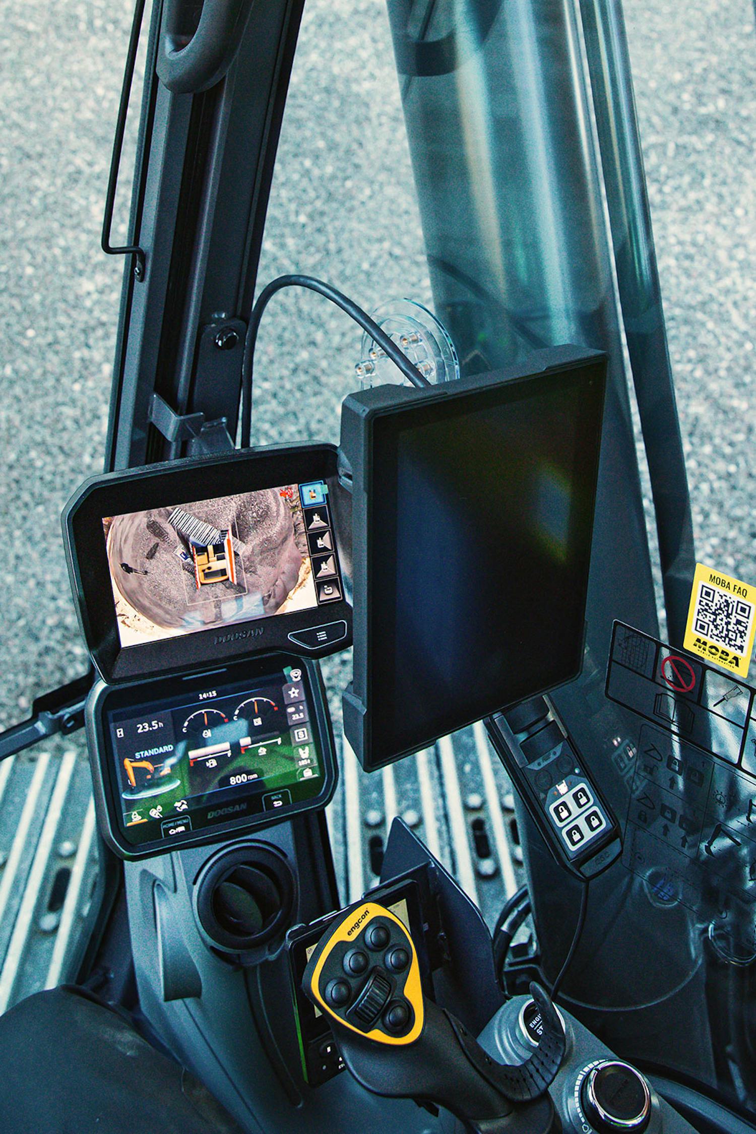 Hytt: Hytten är snyggt utformat och det första jag lägger märke till är att knappar under armstöden nu tagits bort, inte en dag för tidigt! Stolen är i toppklass med värme/kyla med ventilation i konstläder som är lättstädat. En stol i tyg känns genast omodern. Bakom stolen är det rymligt, extra fack med värme och kyla finns för mat och dryck. Knapp i nyckeln för att tända maskinens arbetsbelysning till och från maskinen. Bra övervakning av hela maskinen med Develons 360 kamerasystem samt backsensorer. Bra sikt ut mot höger även i arbetsställning med maskin. Upplever dock att klimatanläggningen pendlar något i värme kyla.