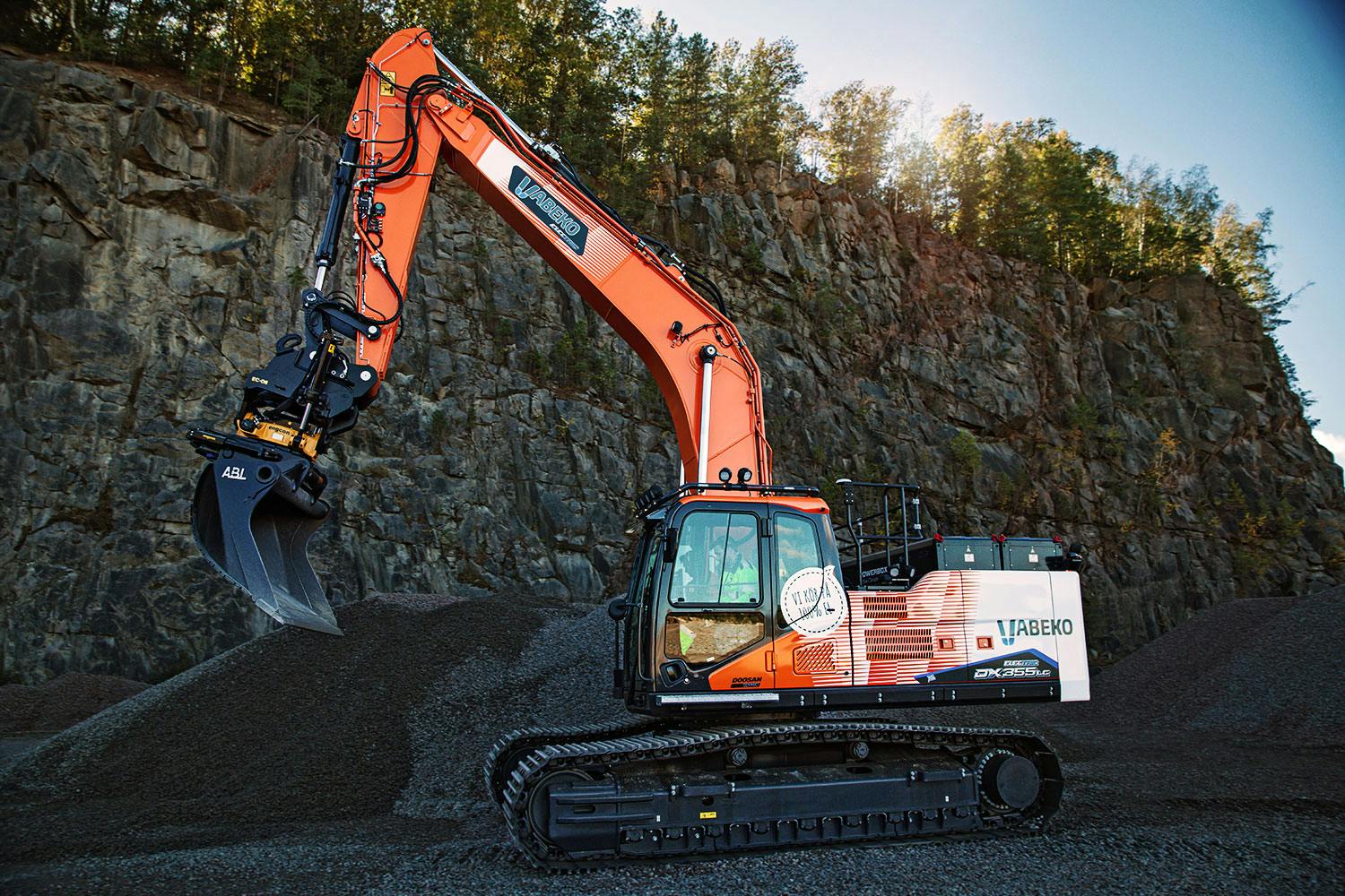 På en slingrig väg ner mot bergtäkten åker jag förbi stora tunga entreprenadfordon som det bolmar svart dieselrök ifrån. Väl nere i berget står den, Develon DX355LC Electric, en mäktig syn och onekligen en katt bland hermelinerna i denna miljö. Självklart ska vi testa den.