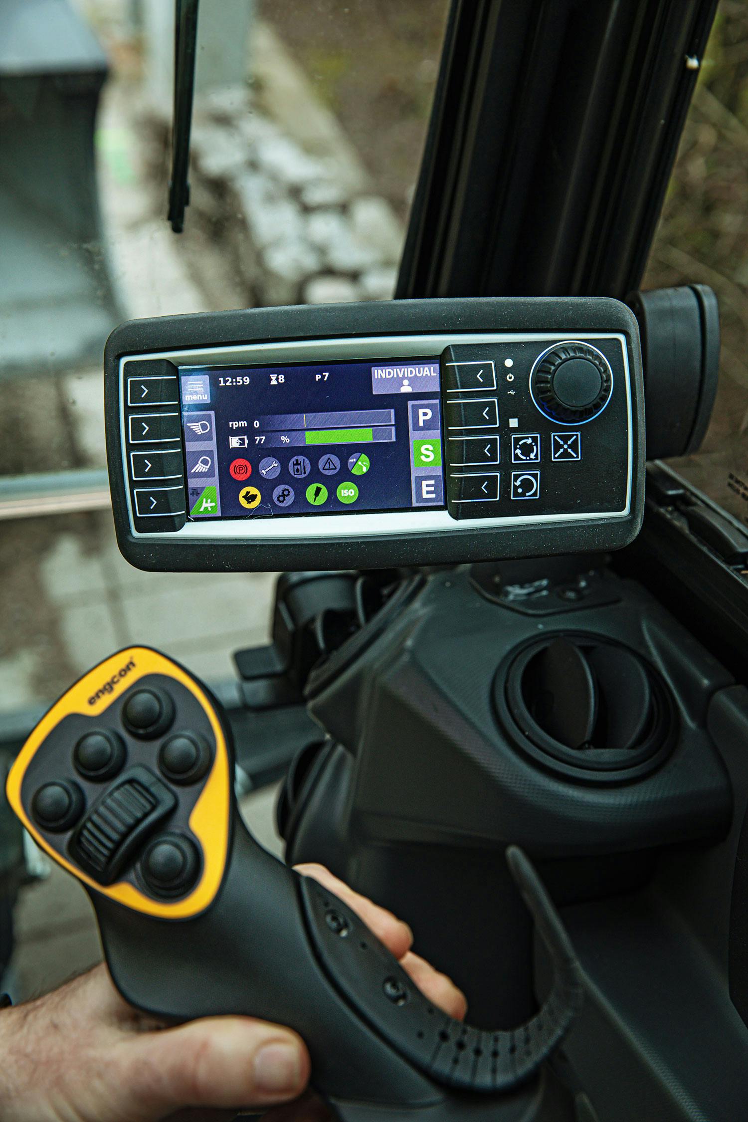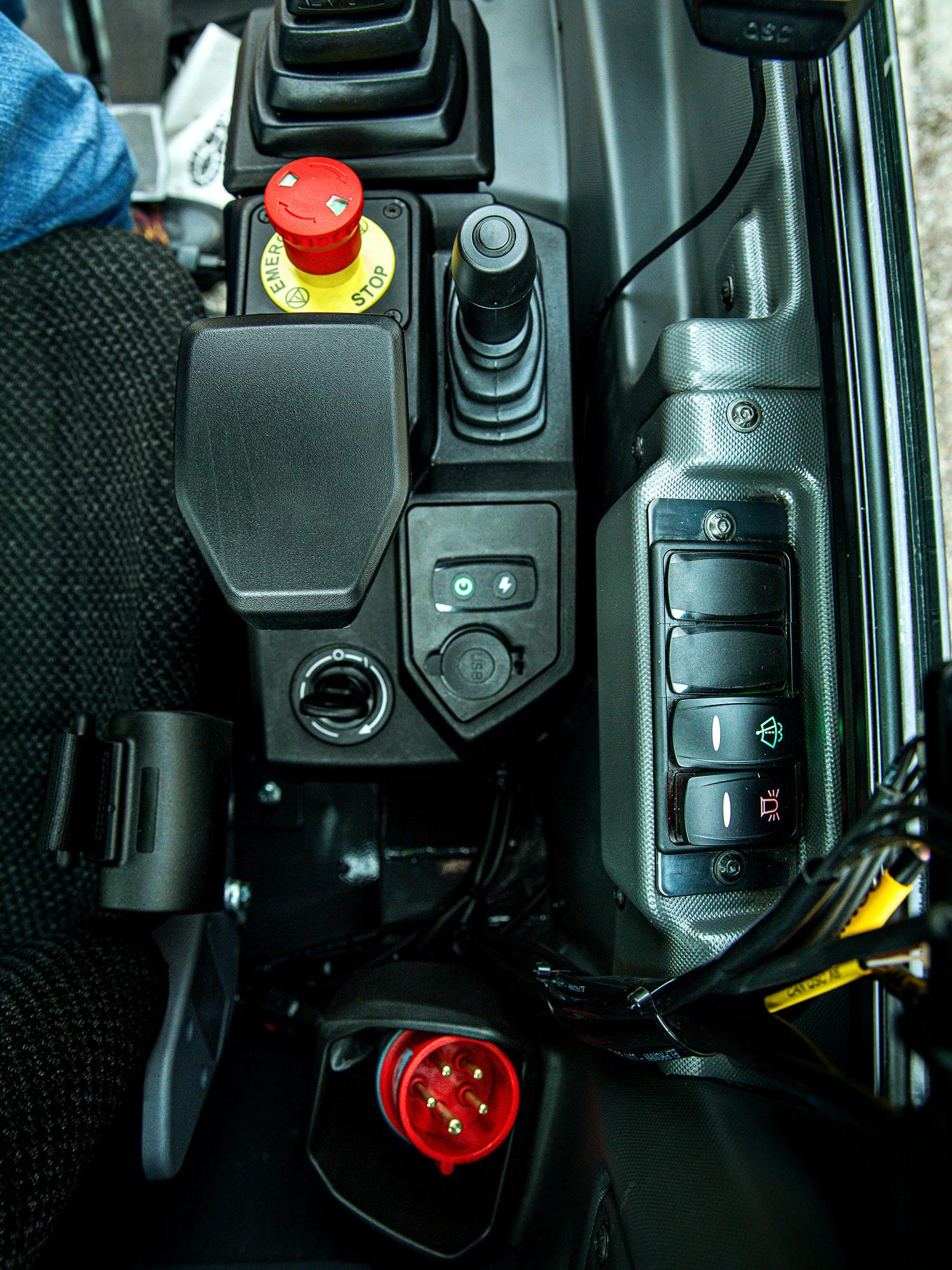 Hydraulik:Hydrauliken kan man enkelt ställa in i menyn, Det finns fem olika program: Fine, Normal, Industri och Heavy, samt Individuell. Utöver det så väljer man i menyn tre olika arbetslägen: Power, Normal och Eco. I det sista programmet, Individuell, kan du ställa in hur du själv vill att maskinen ska gå: 100 procent hastighet på stickan eller bara 67 procent? Här handlar det om en avvägning när elmotorn ska dra igång och slå ifrån för att spara batteri gentemot att få följsamheten direkt från början. Den känns annorlunda mot en diesel i detta avseende.
