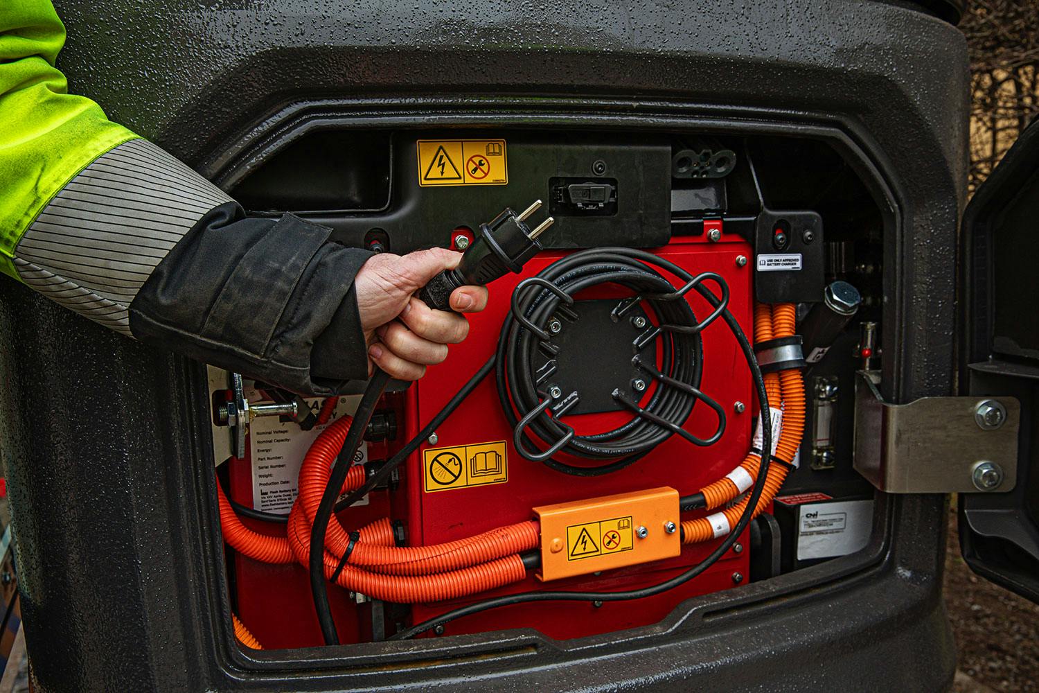 Här är det inte så mycket du kan göra själv förutom att kolla nivån på hydrauloljan samt smörja maskinen. Ladda efter dagens slut eller lite under byggrasten gör föraren enkelt genom att dra ut en kabel från maskinens baksida till vanligt 230 uttag och sedan får nio timmars arbetstid på fullt batteri. Maskinen är även utrustad för snabbladdare om man har tillgång till det, då laddar man ett helt tomt batteri på två timmar. För att komma djupare in i maskinen lossar man två bultar för att fälla hytten framåt, detta testade vid dock inte under provkörningstiden.