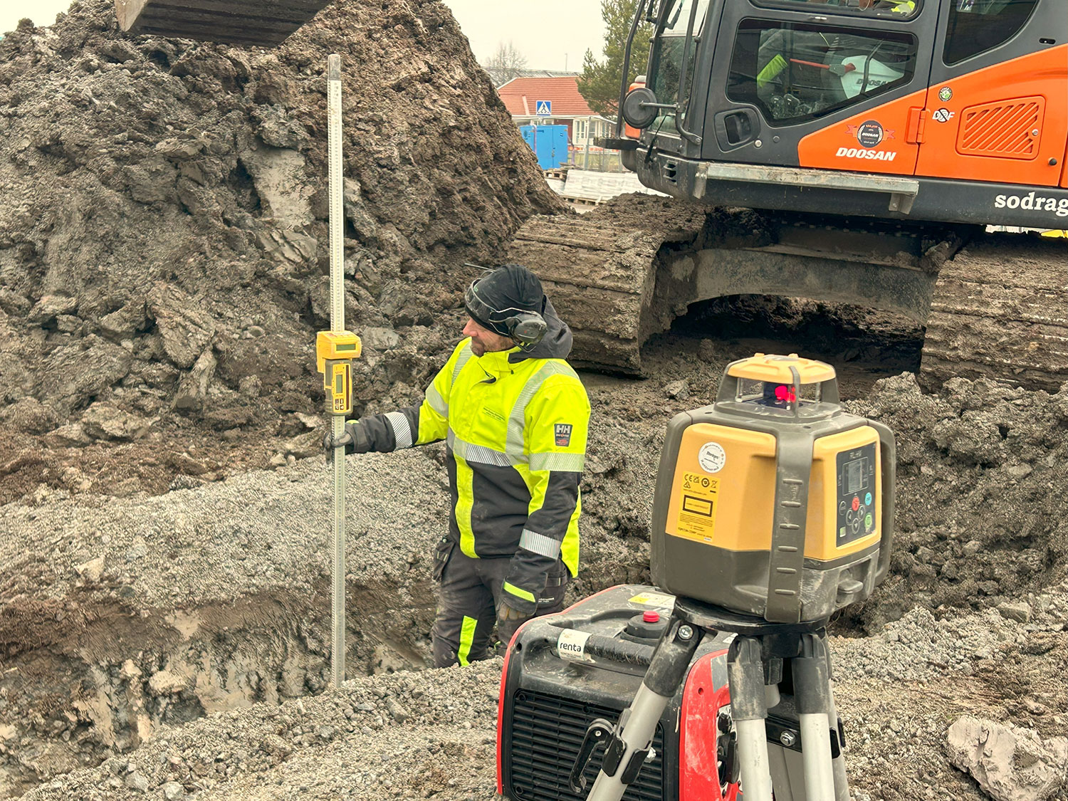 – Hela hanteringen är så enkel att det är nästan omöjligt att misslyckas, menar Mathias Alperud. Jag har jobbat över tjugo år inom entreprenadbranschen och vet hur lätt det kan bli räknefel eller att man råkar sätta lasermottagaren fel på stången. Den här uppfinningen tar bort alla manuella beräkningar och gör utsättningen betydligt enklare.